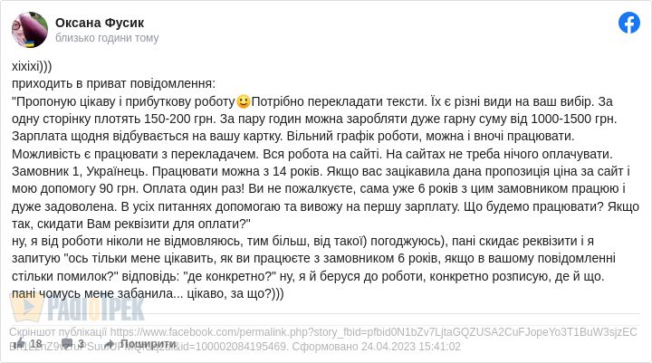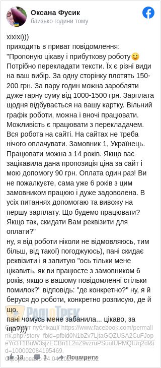 Добре знана рівнянка у Фейсбуці поділилась своїм досвідом «спілкування» з охочими допомогти з підробітком.