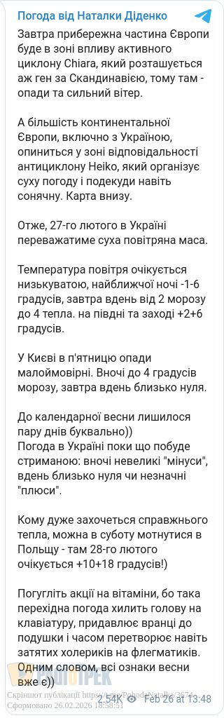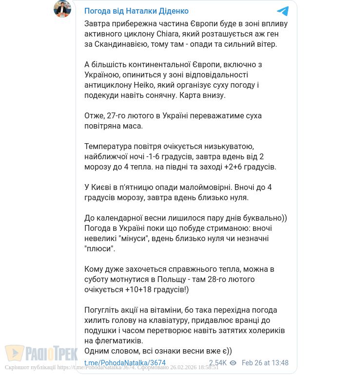 Завтра, 27 лютого, більшість континентальної Європи, включно з Україною, буде під впливом антициклону Heiko. Завдяки йому в країні буде тепло, подекуди навіть сонячно, повідомила синоптик Наталка Діденко.