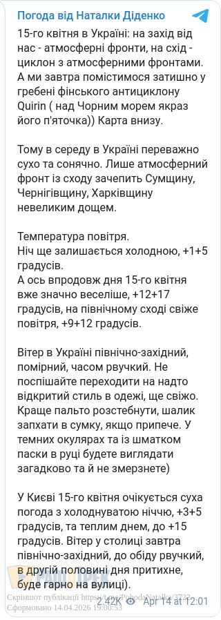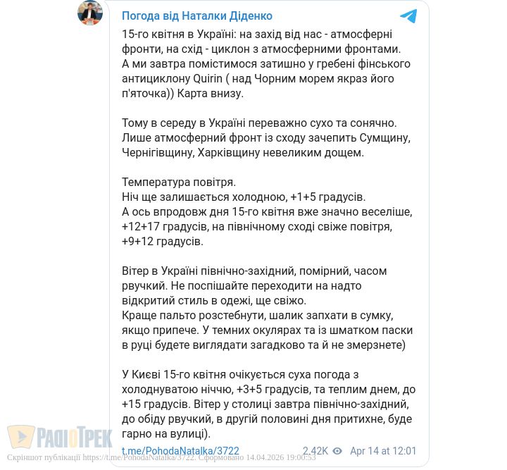 Зaвтра, 15 квітня, Укрaїнa ще буде під впливом фінського антициклону Quirin. Тож в середу перевaжно буде сухо та сонячно.