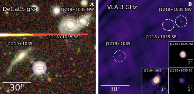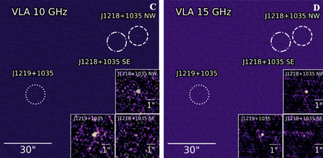 Цю рідкісну систему вчені спостерігали за допомогою радіотелескопів. Кожна чорна діра поглинає газ і пил, через що випускає енергійні струмені радіохвиль.