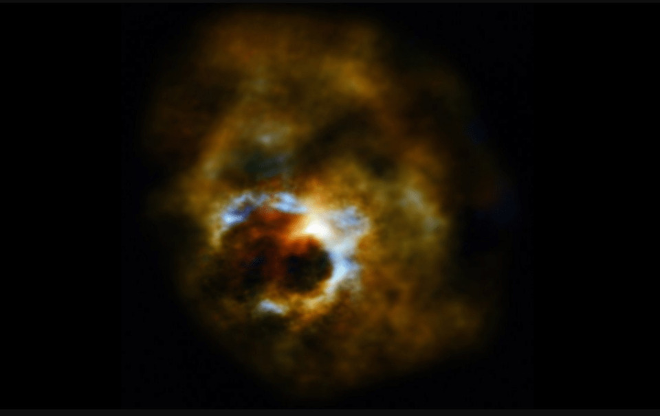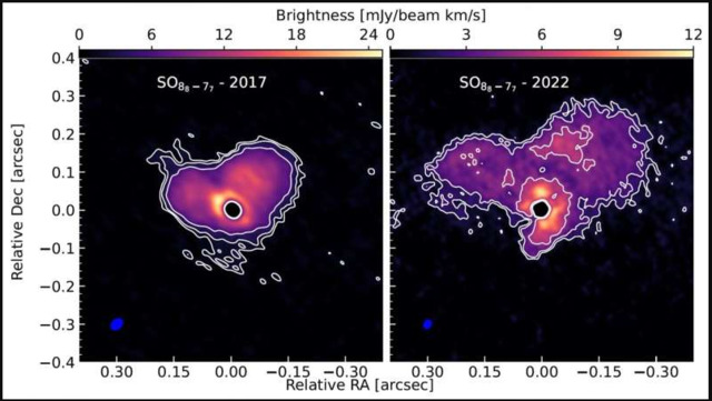 Вони виявили, що викинута речовина в сім разів перевищує масу Землі, а газ утворює серцеподібну структуру, тоді як пил збирається на її краях.