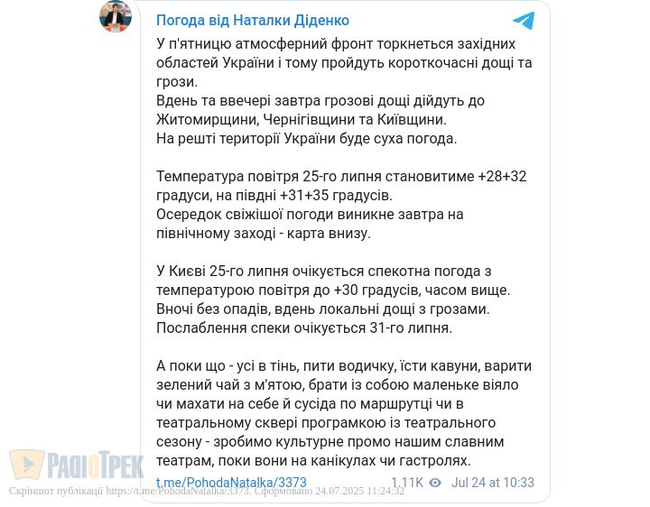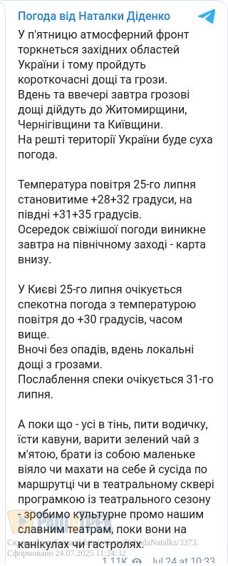 Вдень та ввечері грозові дощі дійдуть також до Житомирщини, Чернігівщини та Київщини. На решті території України буде сухо, повідомила синоптик Наталка Діденко.