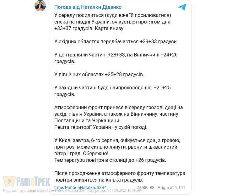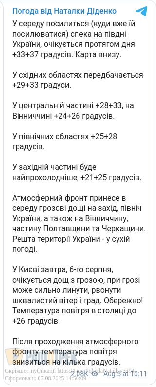 Завтра, 6 серпня, на Півдні України посилиться спека. Протягом дня там очікується до +33...+37 градусів, повідомила синоптик Наталка Діденко.