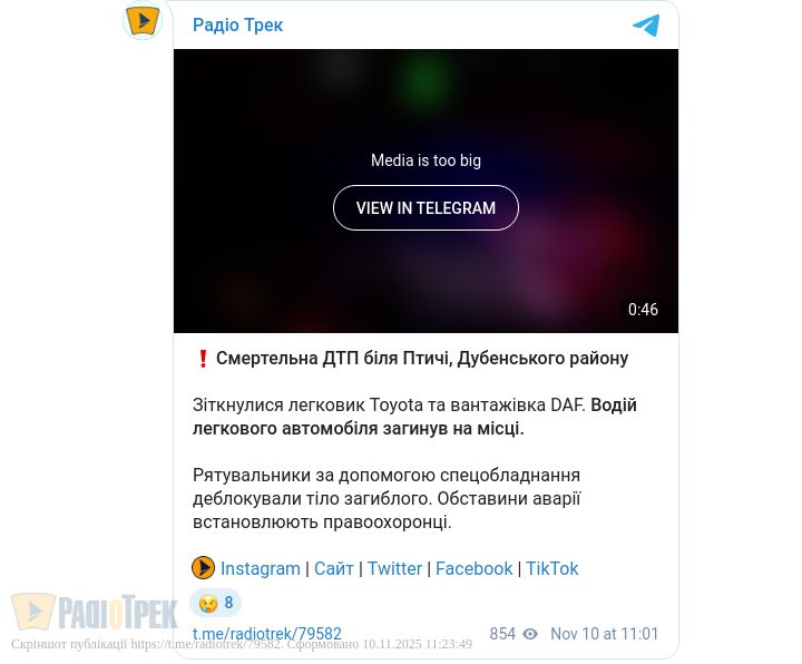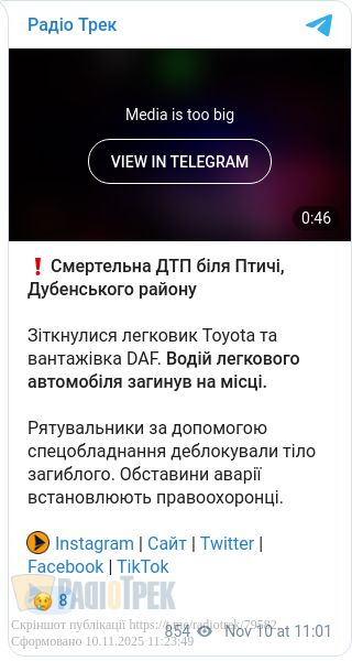 Смертельна ДТП сталася біля Птичі, що у Дубенськогму районі. Там зіткнулися легковик Toyota та вантажівка DAF.