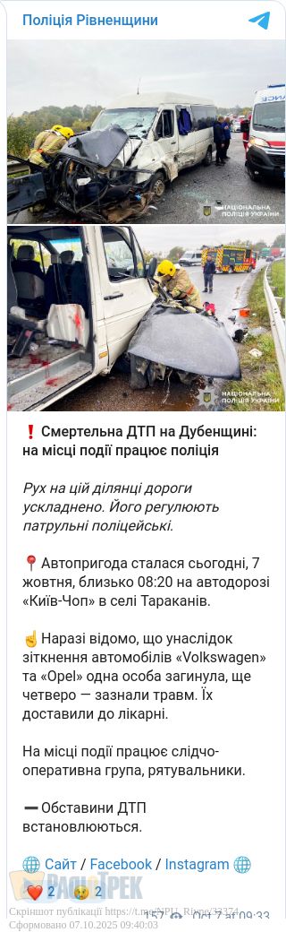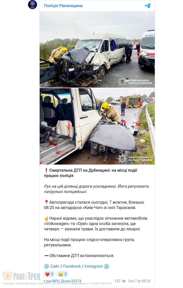 Наразі відомо, що унаслідок зіткнення автомобілів «Volkswagen» та «Opel» одна особа загинула, ще четверо — зазнали травм. Їх доставили до лікарні.