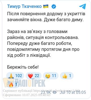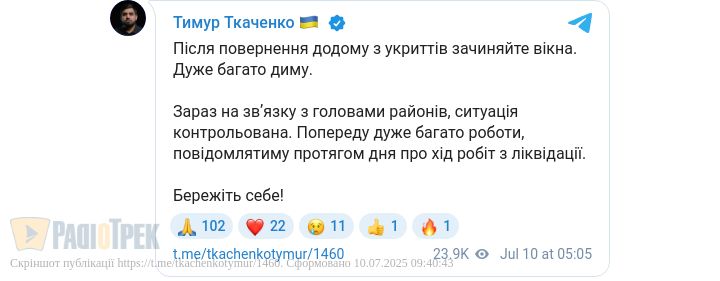 Дуже багато диму. На звʼязку з головами районів, ситуація контрольована. Попереду дуже багато роботи, повідомлятиму протягом дня про хід робіт з ліквідації, – йдеться у повідомленнях Тимурa Ткaченкa.