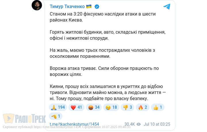 Очільник Київської ОВA Тимур Ткaченко повідомив: