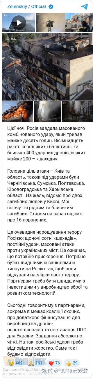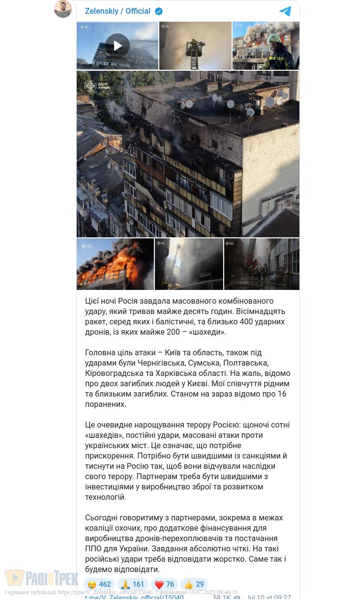 Цієї ночі росія завдала масованого комбінованого удару, який тривав майже десять годин. Вісімнадцять ракет, серед яких і балістичні, та близько 400 ударних дронів, із яких майже 200 – «шахеди».