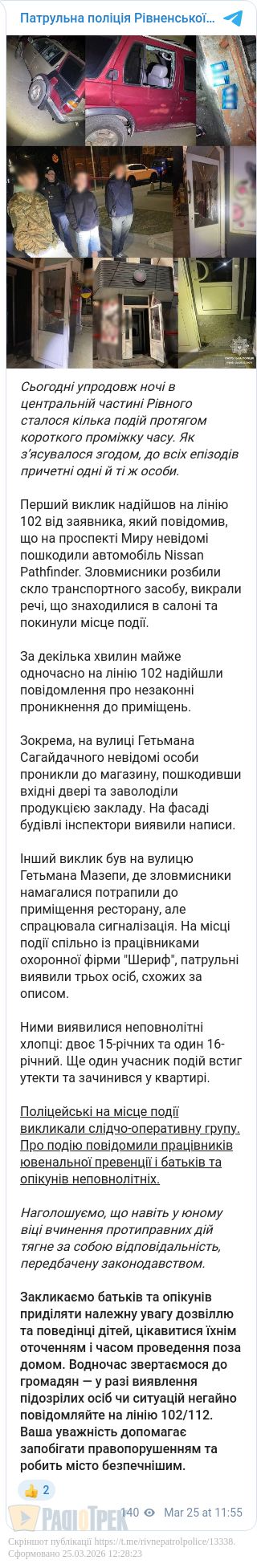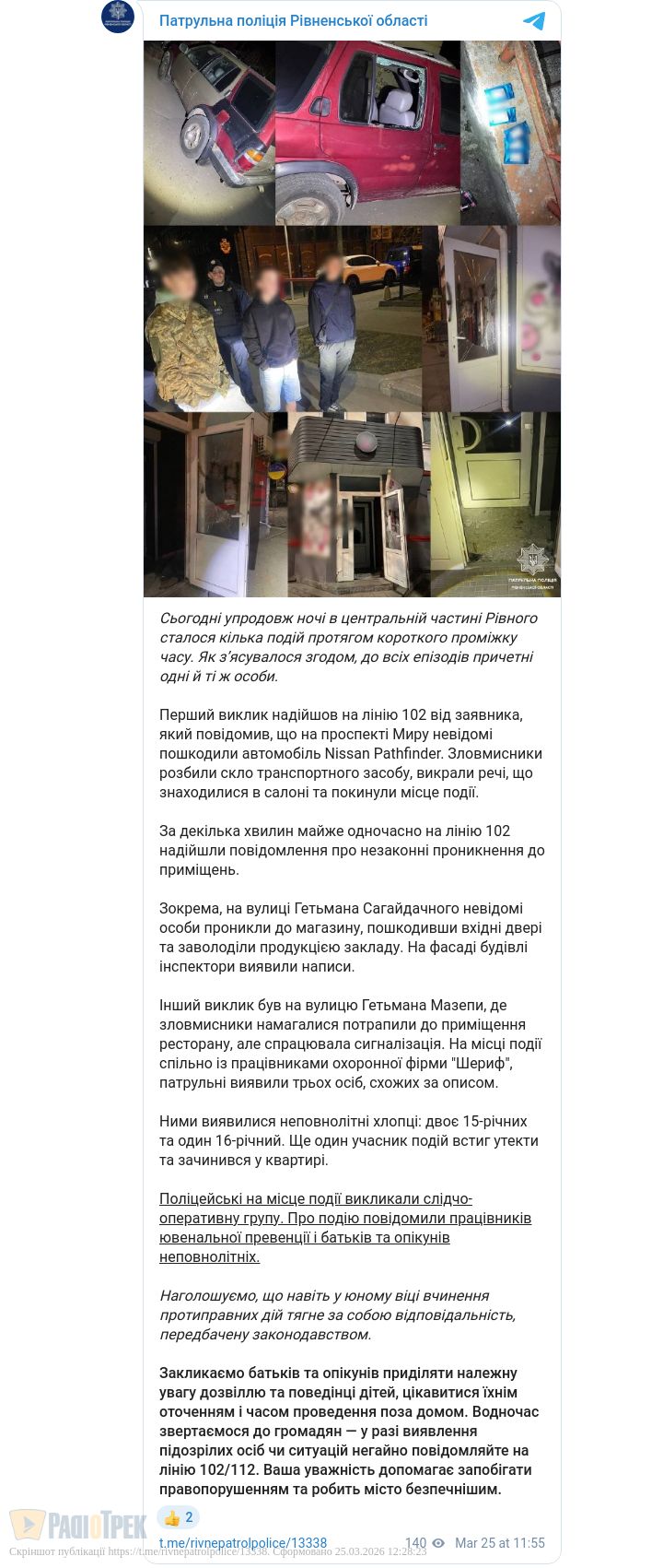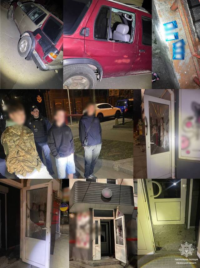 Серія злочинів цієї ночі сталася у центрі Рівного. Четверо зловмисників на проспекті Миру пошкодили авто та викрали речі з салону, а також проникли до магазину на вулиці Гетьмана Сагайдачного й намагалися потрапити до ресторану, що неподалік.