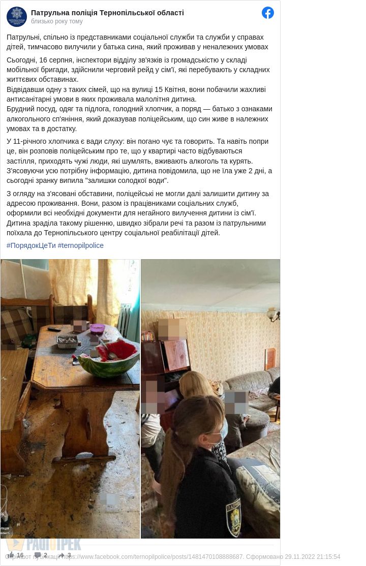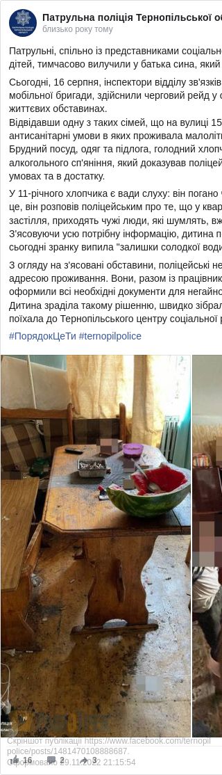 Патрульні у Тернополі спільно із представниками соціальної служби та служби у справах дітей, тимчасово вилучили у батька сина. Дитина проживала у неналежних умовах.