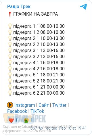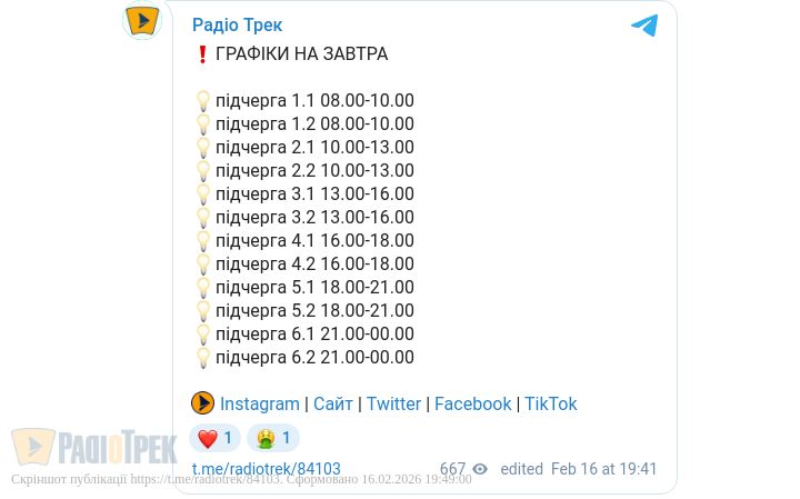 У зв’язку зі складною ситуацією в енергосистемі держави НЕК «Укренерго» дало команду запровадити на Рівненщині у вівторок, 17 лютого, графік погодинних відключень електроенергії: