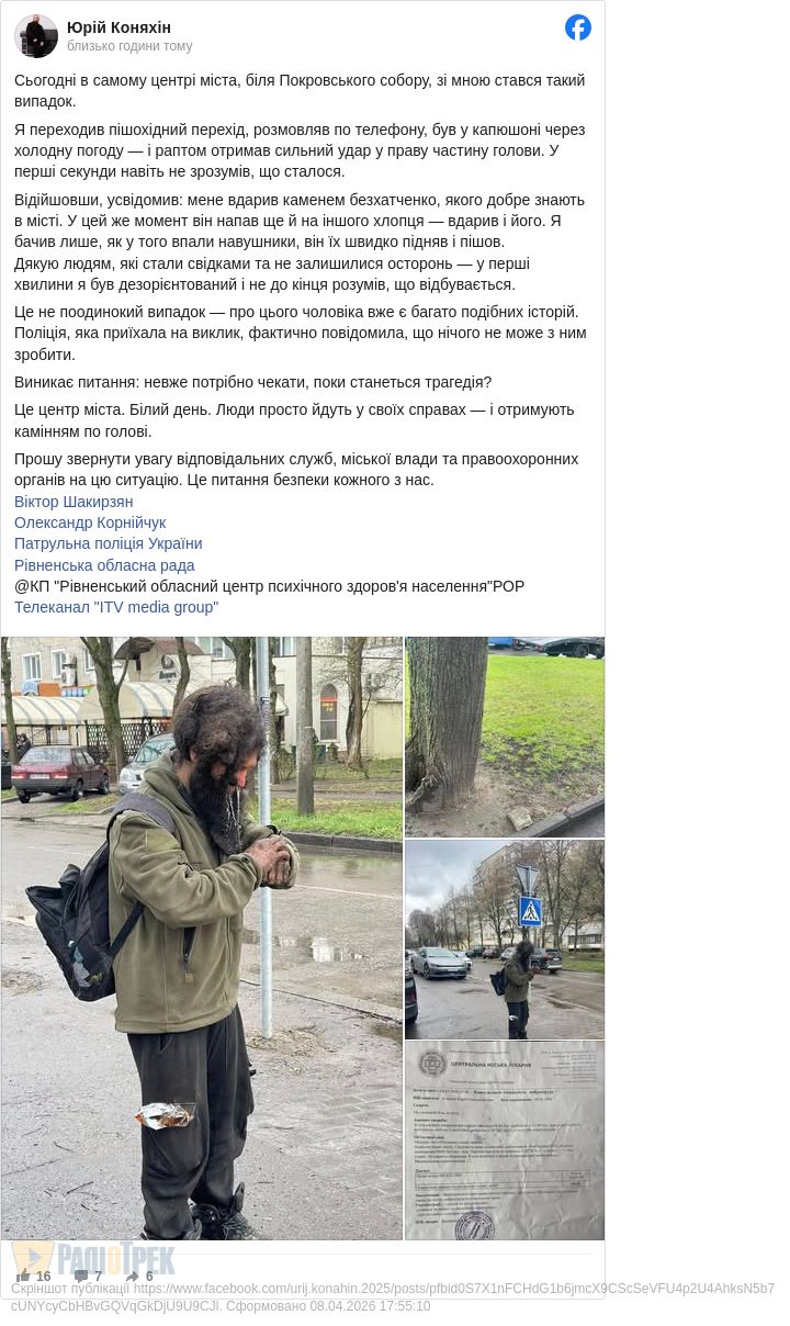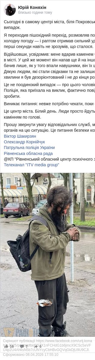 Як повідомляє Юрій Коняхін, конкретно на нього напав у Рівному чоловік, який, очевидно, мав би десь лікуватися, чи утримуватися за державний кошт, але…