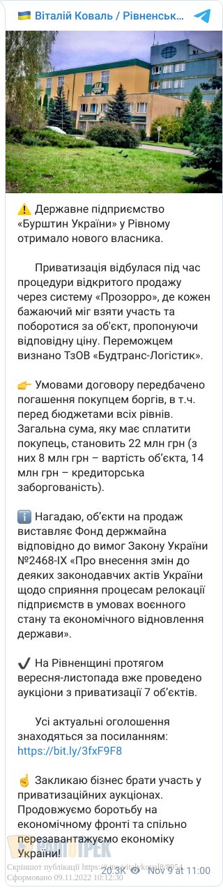 - Загальна сума, яку має сплатити покупець, становить 22 млн грн. З них 8 млн грн – вартість об’єкта. Також підприємство має заборгованість 14,5 млн грн. Покупець зобов’язаний протягом 6 місяців погасити заборгованість із заробітної плати та перед бюджетом.
