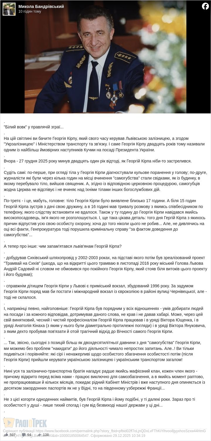 «Білий вовк» у правлячій зграї: відомий історик зі Львова написав про Георгія Кирпу (ФОТО)