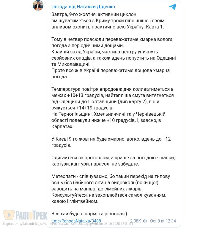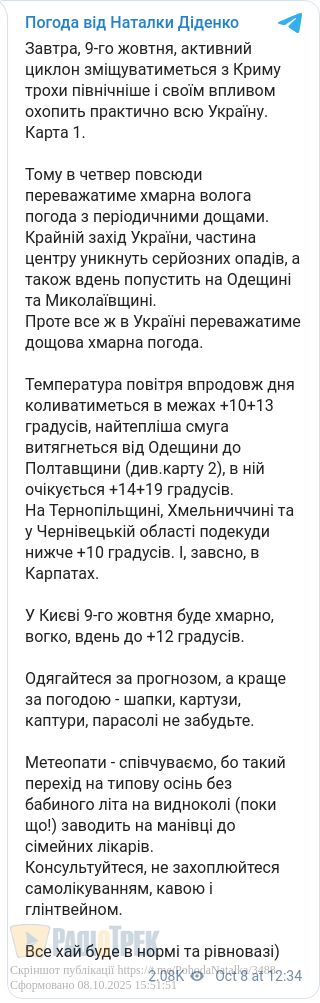 Завтра, 9 жовтня, повсюди переважатиме хмарна волога погода з періодичними дощами, повідомила синоптик Наталка Діденко.