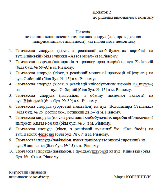 Рівне продовжують звільняти від незаконно встановлених тимчасових споруд. На сайті Рівнеради оприлюднили проєкт рішення виконкому з переліком об'єктів, які підлягають демонтажу.