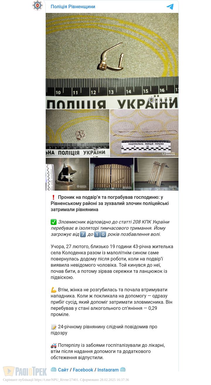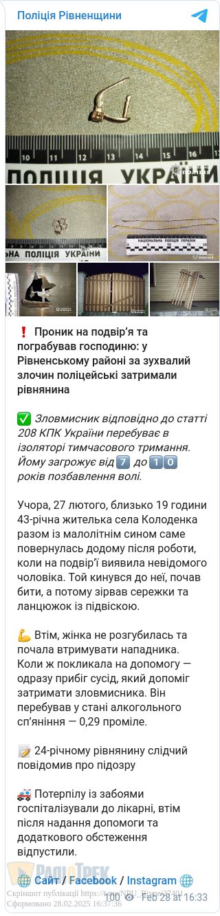 Учора, 27 лютого, близько 19 години 43-річна жителька села Колоденка разом із малолітнім сином саме повернулась додому після роботи, коли на подвір’ї виявила невідомого чоловіка. Той кинувся до неї, почав бити, а потому зірвав сережки та ланцюжок із підвіскою.