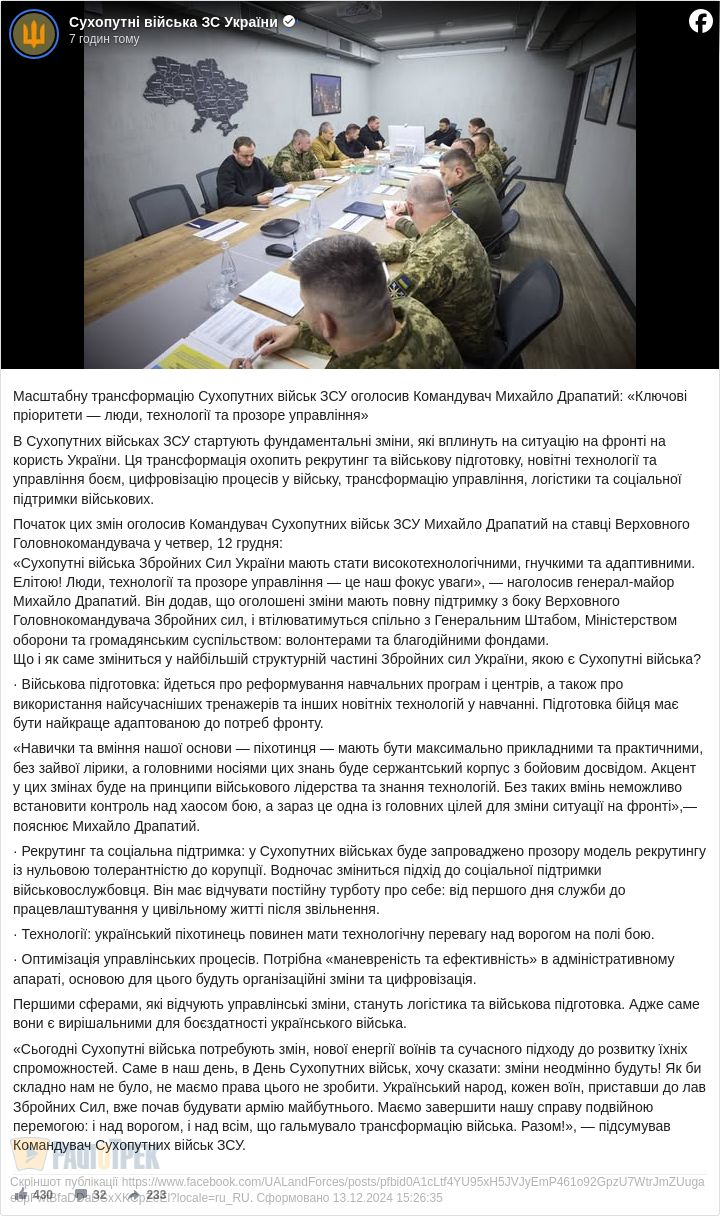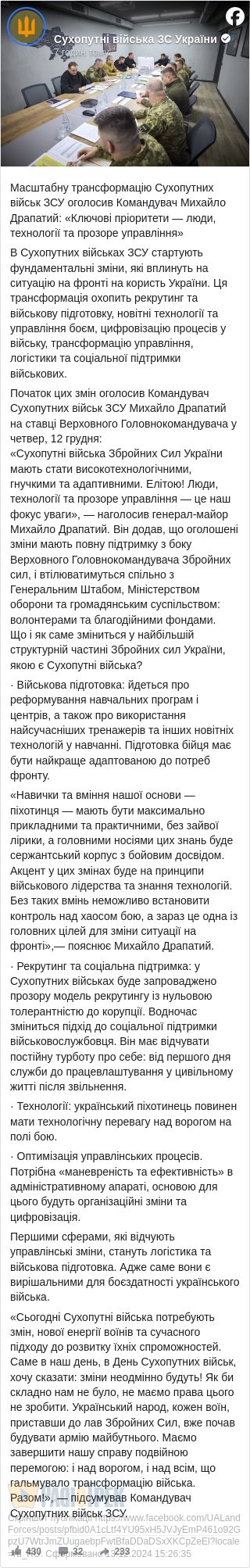 Сухопутні війська ЗСУ мають стати високотехнологічними, гнучкими та адаптивними. Елітою. Зараз утримаюсь від деталей. Працюватимемо тут спільно та злагоджено з командою Генерального штабу, президента України, Міністерства оборони та інших міністерств, нашим тилом – волонтерами та фондами, – пояснив Михайло Драпатий.