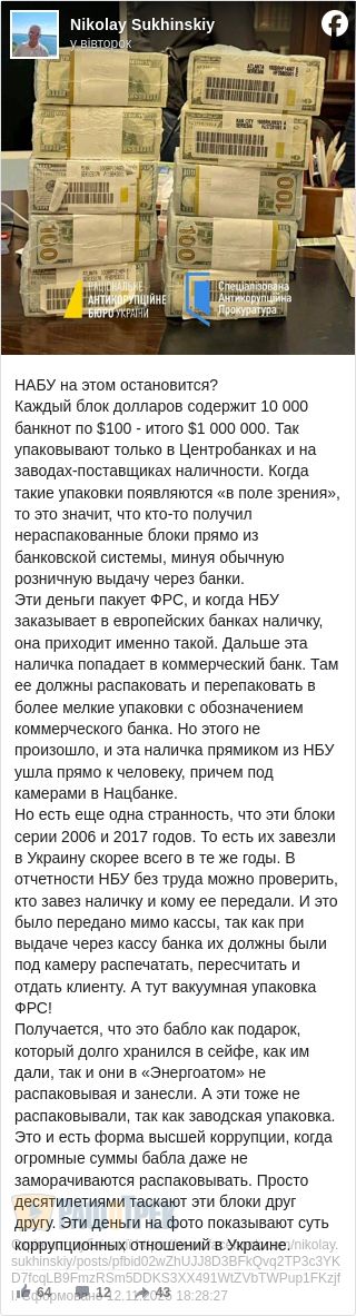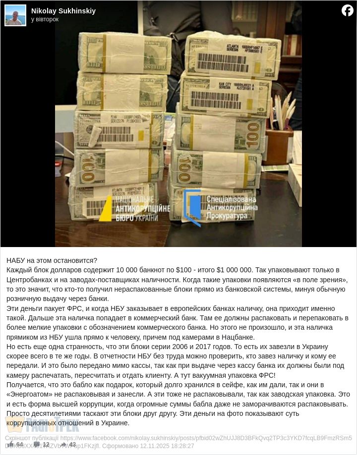 Автор допису, що його поширив Олег Єльцов, стверджує, що в подібному «нерозібраному» пакуванні ці мільйони доларів можна було винести з Нацбанку лише за прямої вказівки його Голови.