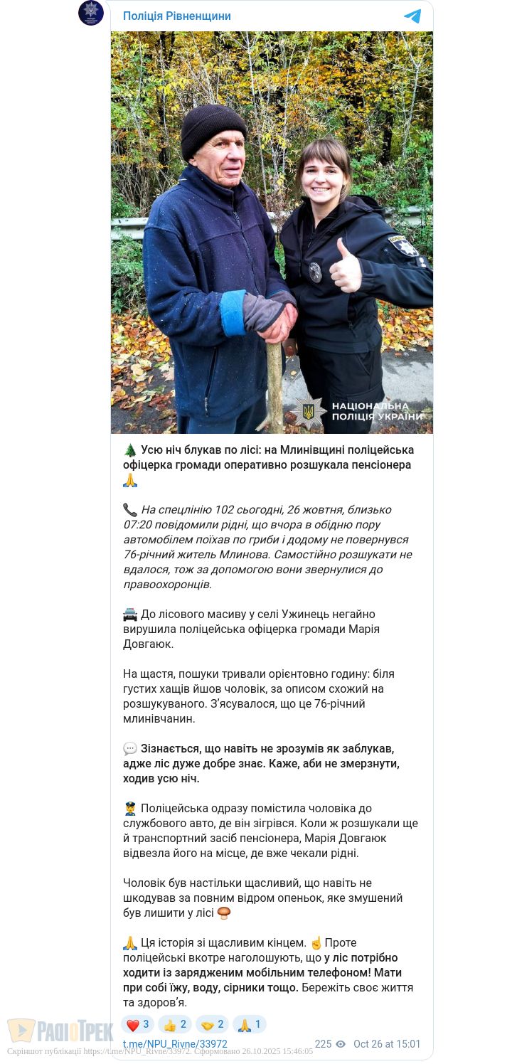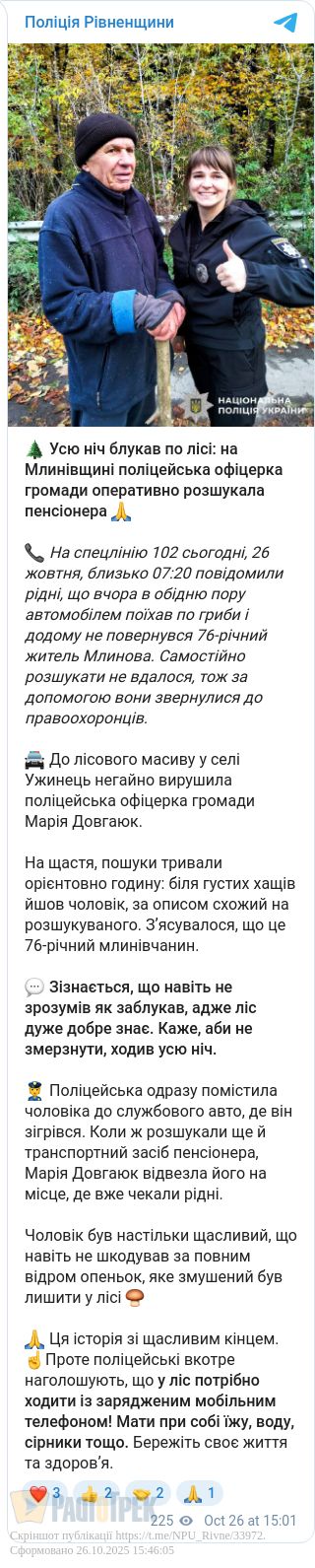 На Млинівщині розшукали пенсіонера, який пішов по гриби та не повернувся. Про зникнення 76-річного чоловіка до поліції повідомили його родичі.