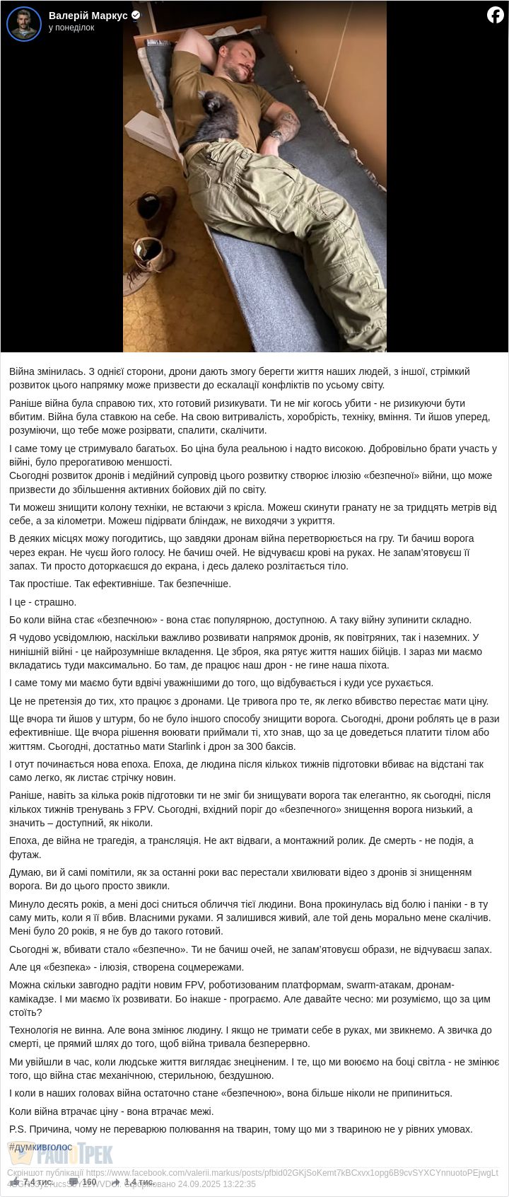 Технологія не винна. Але вона змінює людину. І якщо не тримати себе в руках, ми звикнемо. А звичка до смерті, це прямий шлях до того, щоб війна тривала безперервно.