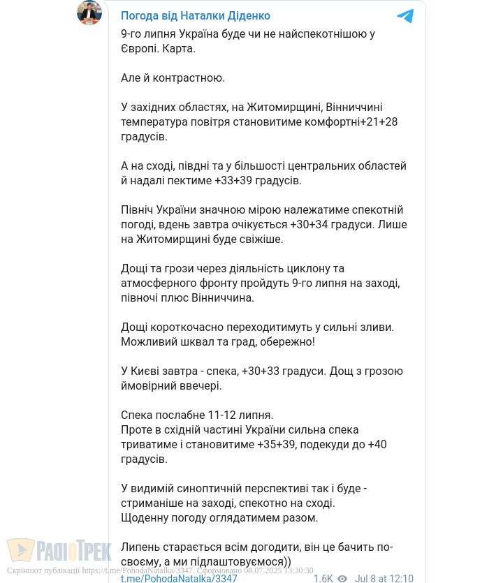 Лише на Сході в цей час припікатиме до +35...+39 градусів, а подекуди буде до +40 градусів, повідомила синоптик Наталка Діденко.