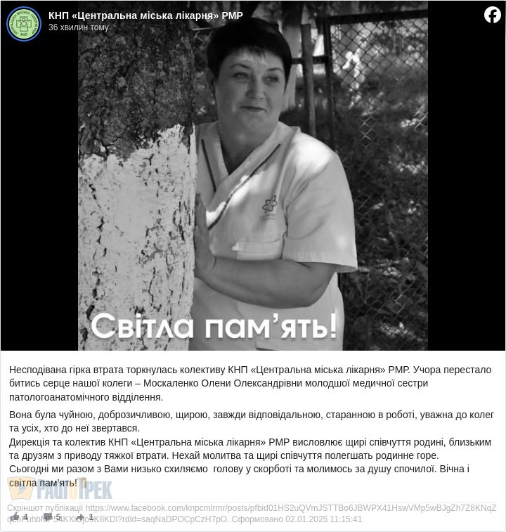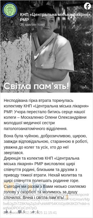Сумну звістку повідомили на сторінці міської лікарні у мережі.