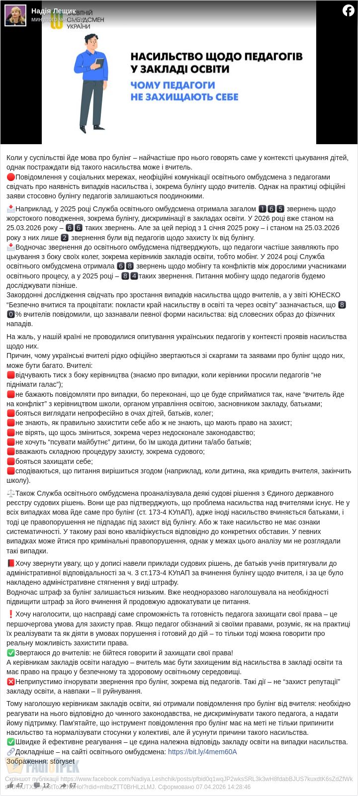 Освітній омбудсмен Надія Лещик наголошує, що керівники шкіл не можуть ігнорувати скарги вчителів на булінг – від учнів або колег.