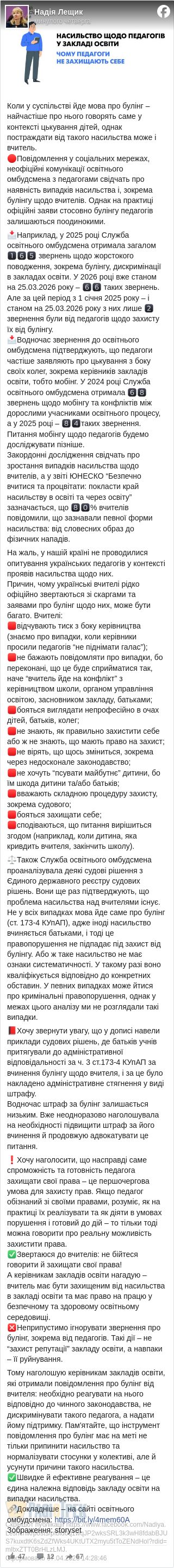 Надія Лещик додала, що вчителі рідко скаржаться на булінг від учнів. Набагато частіше вони стикаються з мобінгом – цькуванням від колег чи керівництва.