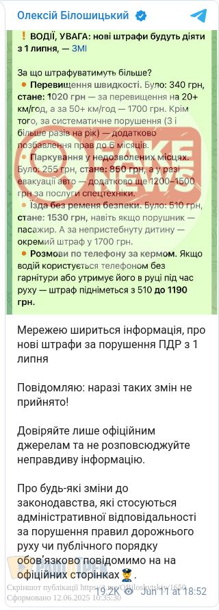 Вчора у різних телеграм-каналах з'явилася інформація, що з 1 липня в Україні набувають чинності зміни, які стосуються правил дорожнього руху. Мовляв, розмір штрафів переглянуть.