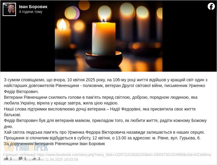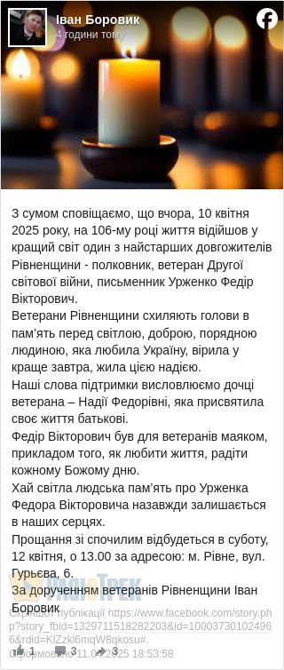 Сумну звістку повідомив у мережі рівнянин Іван Боровик.