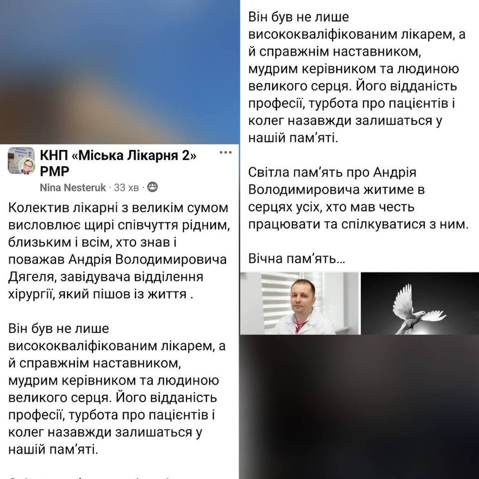 Помер завідувач відділення хірургії міської лікарні №2 Андрій Дягель. Про його смерть повідомили на сторінці медзакладу у фейсбуці.