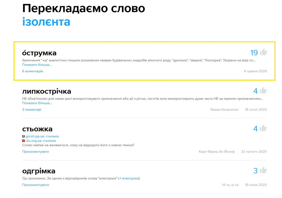 Рамі Аль Шаєр, фронтмен групи Бульвари ЛУ та популяризатор української мови, на своїй сторінці в Instagram також згадує про варіанти «острумка» та «одгрімка» і жалкує, що вони не є офіційними та закріпленими в словниках української мови. Проте називає і найпростіший варіант, який точно запам’ятають всі: ізоляційна стрічка. Або ж просто ізострічка.