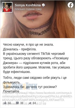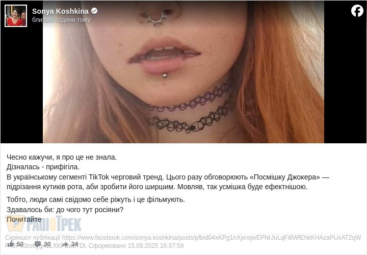 В українському сегменті TikTok черговий тренд. Цього разу обговорюють «Посмішку Джокера» – підрізання кутиків рота, аби зробити його ширшим. Мовляв, так усмішка буде ефектнішою.