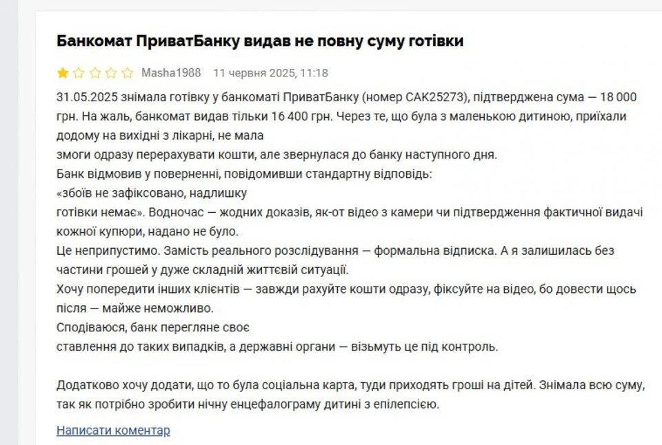 Жінка розповіла, що знімала 18 000 грн у банкоматі з номером CAK25273, але отримала лише 16 400 грн — тобто на 1600 грн менше.
