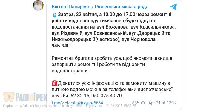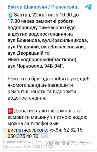 7 вулиць на Басовому куті і у мікрорайоні південний у Рівному завтра будуть без води через ремонтні роботи мереж.