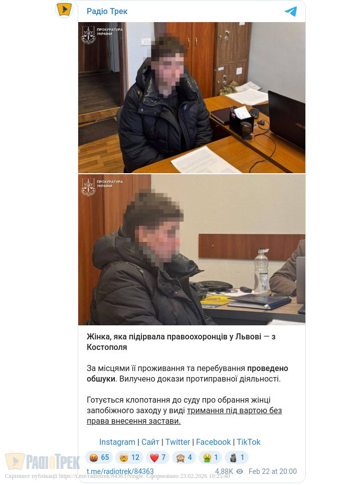 Нагадаємо, в ніч на 22 лютого у Львові пролунав вибух. У місті стався теракт, унаслідок чого загинула поліцейська, а ще 25 людей отримали поранення.