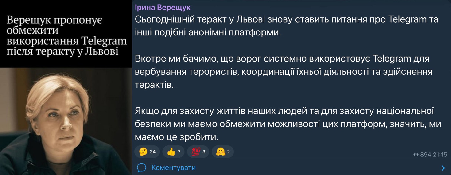 Принаймні, після теракту у Львові – за участі дивної жінки з Рівненщини – заступниця керівника Офісу Президента Ірина Верещук закликала переглянути обмеження соціальної мережі Telegram та інших анонімних платформ в Україні.
