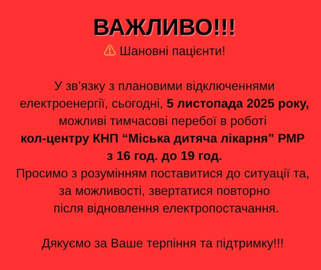 Через планові відключення світла у медзакладах Рівного можуть некоректно працювати кол-центри. Зокрема, про таку ситуацію попереджає адміністрація міської дитячої лікарні.