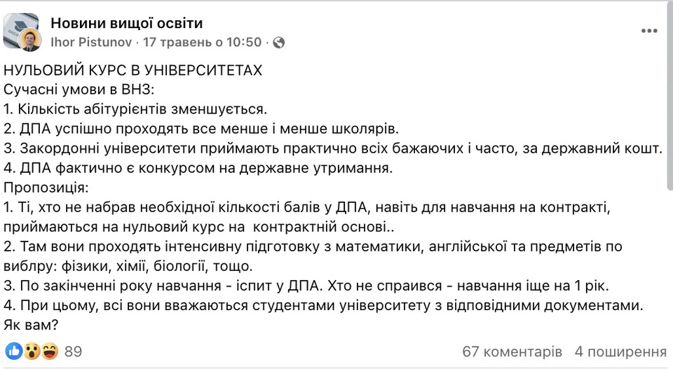 Професор Національного технічного університету «Дніпровська політехніка» Ігор Пістунов запропонував ввести в Україні нульовий курс при закладах вищої освіти. Він зауважив, що нині зменшується кількість абітурієнтів, випускний іспит складає все менше учнів, а іноземні виші приймають всіх бажаючих і навіть на бюджет.