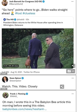 А Байден, замість того, щоб піти по вимощеній доріжці до дверей (куди вказав охоронець), сходить з доріжки і йде на автоматі у кущі. За охоронцем?