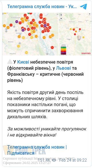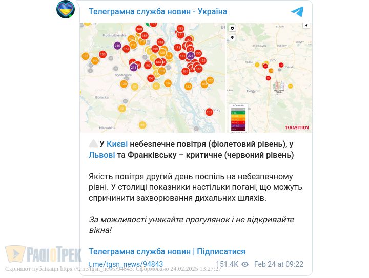 Згідно з даними сервісу SaveEcoBot у Києві через небезпечне повітря оголошено «фіолетовий» рівень небезпеки, у Львові та Івано-Франківську рівень забрудненості на критичному рівні – «червоному».
