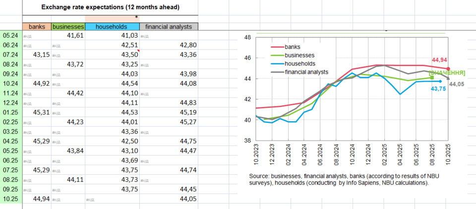 У жовтні банкіри очікують курс 44,94 грн/дол, аналітики — 44,05 грн/дол.