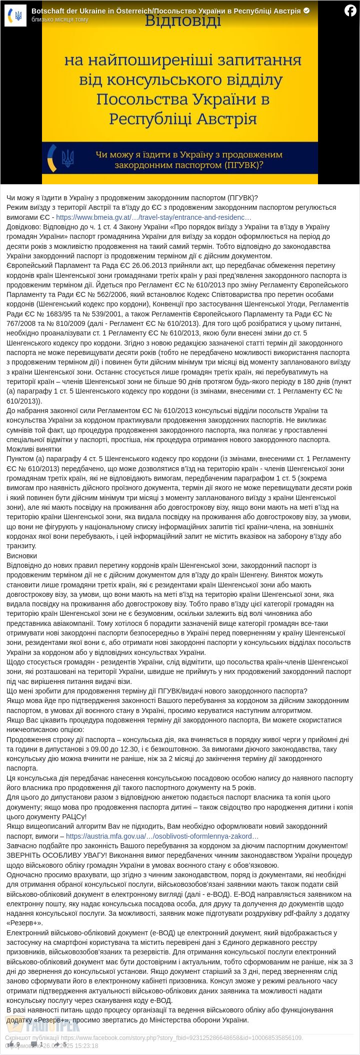 Продовження терміну дії є безплатною консульською послугою, що надається у дипломатичних установах за попереднім записом або в порядку живої черги у визначені години.