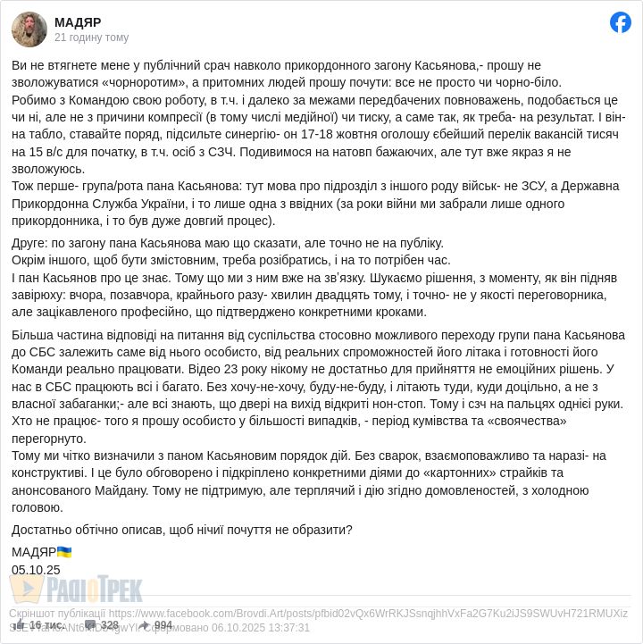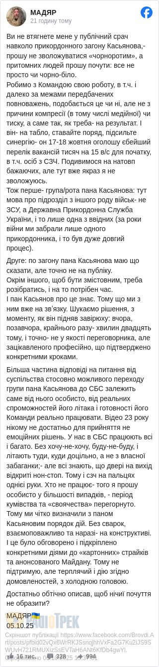 - Вдячний МАДЯР за його позицію. Ми дійсно з ним на зв'язку.