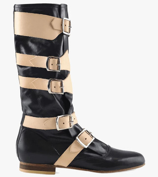 Це високі обтислі шкіряні чоботи із золотою пряжкою під коліном — ніби взуття героя з казки Disney. У лінійці представлено кілька кольорів: гірчично-жовтий, насичений пурпуровий та глибокий шоколадний.