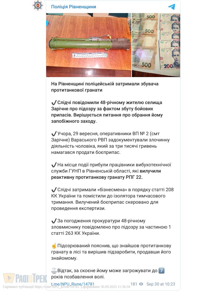 На Рівненщині поліцейські затримали продавця протитанкової гранати.