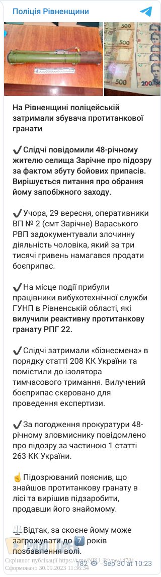 Учора, 29 вересня, оперативники затримали чоловіка, який за 3 тисячі гривень намагався продати реактивну протитанкову гранату РПГ 22.