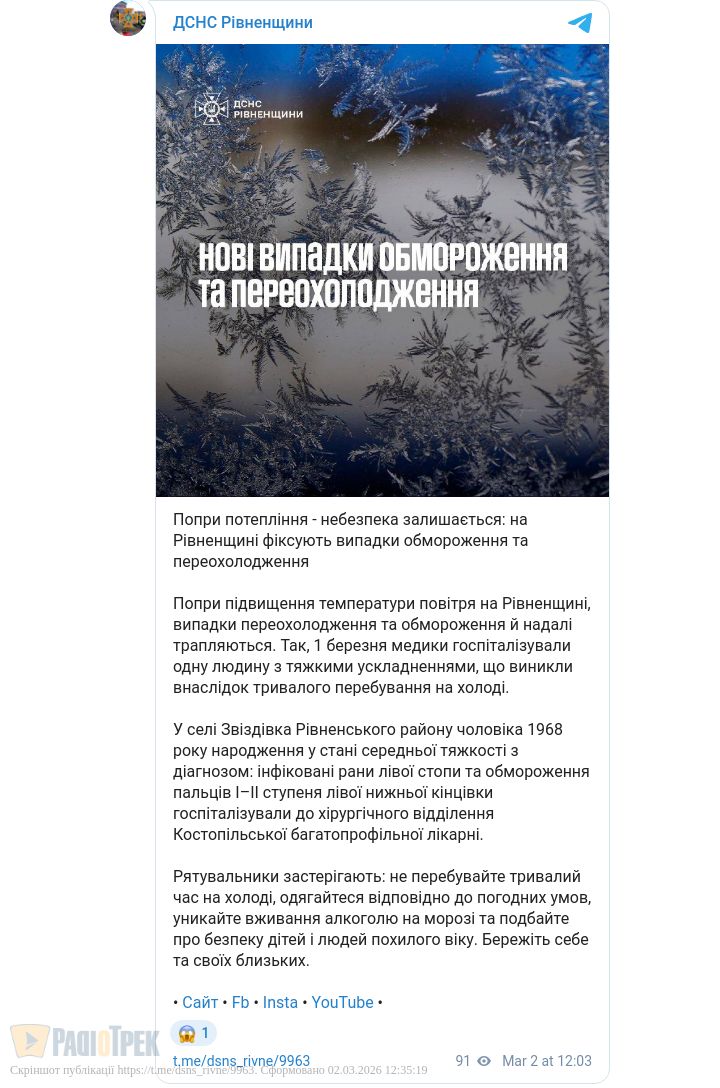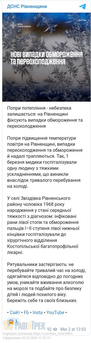Чоловік постраждав від холоду на Рівненщині: госпіталізували до хірургії