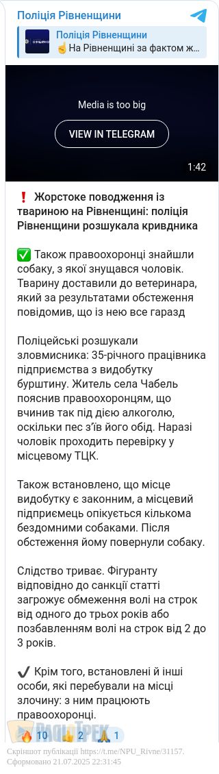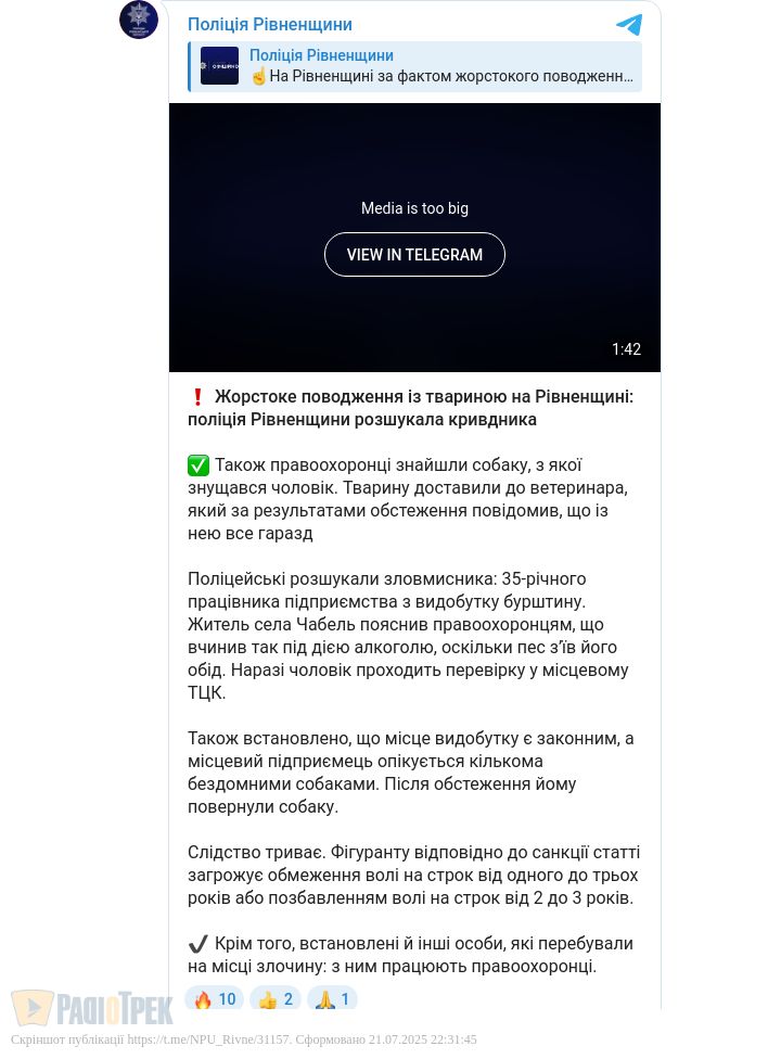Поліція Рівненщини розшукала кривдника, який знущався над твариною.